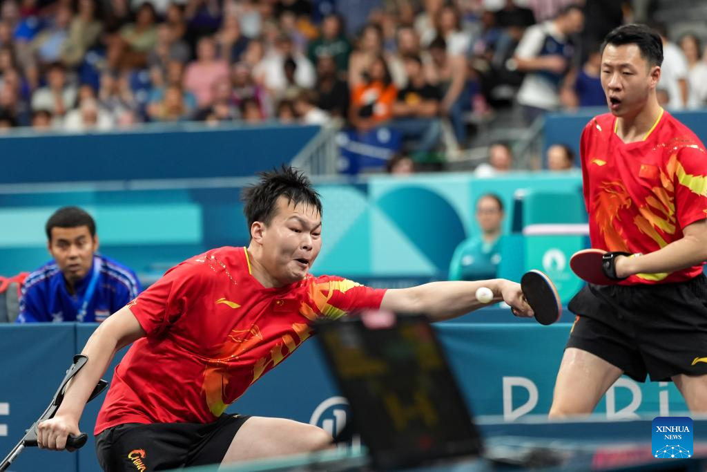 Liao Keli (R)/Yan Shuo of China compete during the Para Table Tennis Men's Doubles MD14 final against Rungroj Thainiyom/Phisit Wangphonphathanasiri of Thailand at the Paris 2024 Paralympic Games in Paris, France, Sept. 1, 2024. (Xinhua/Zhang Cheng)