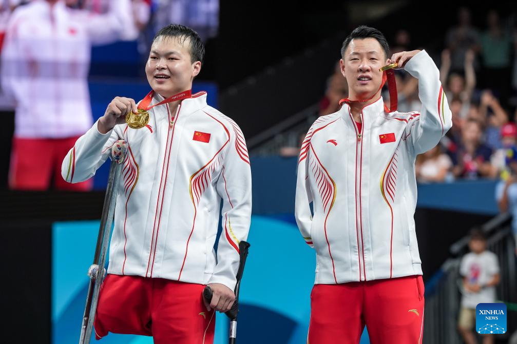 Gold medalists Liao Keli (R)/Yan Shuo of China celebrate during the awarding ceremony for the Para Table Tennis Men's Doubles MD14 event at the Paris 2024 Paralympic Games in Paris, France, Sept. 1, 2024. (Xinhua/Zhang Cheng)