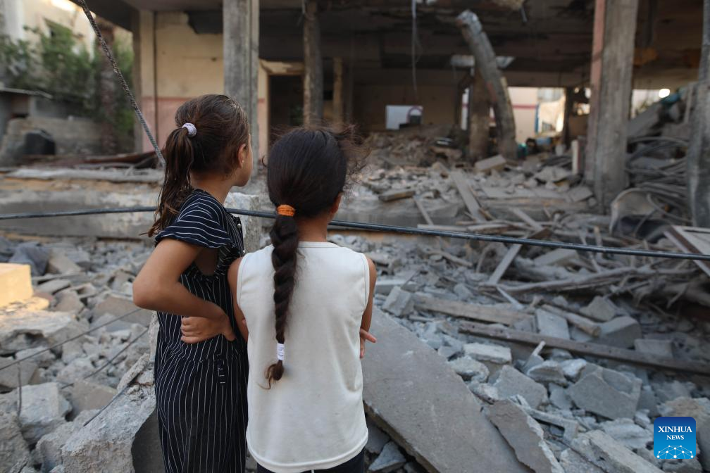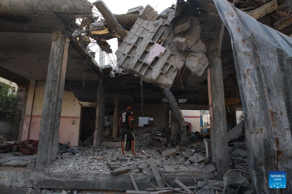 Palestinians are seen while looking at the damage to a house attacked by the Israeli army in the Nuseirat refugee camp in central Gaza, on Aug. 31, 2024. Gaza-based health authorities reported on Saturday that the Palestinian death toll from the ongoing Israeli attacks has reached 40,691. (Photo by Marwan Dawood/Xinhua)