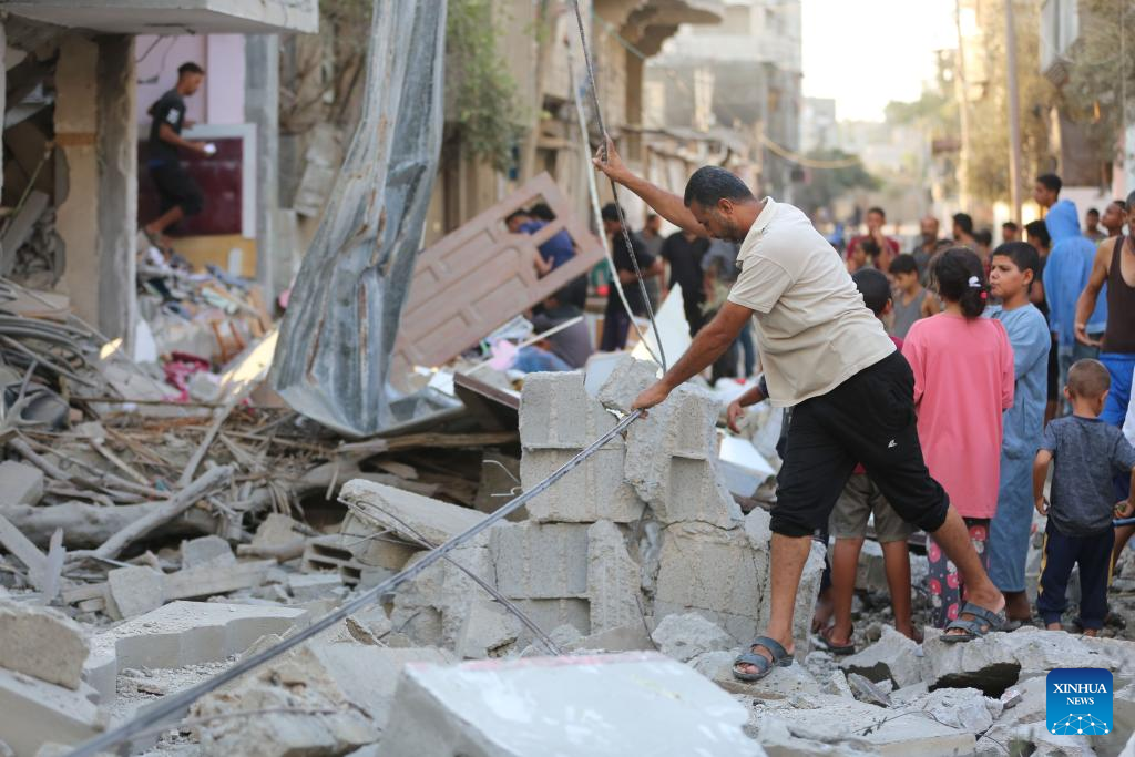 Palestinians check the damaged house attacked by the Israeli army in the Nuseirat refugee camp in central Gaza, on Aug. 31, 2024. Gaza-based health authorities reported on Saturday that the Palestinian death toll from the ongoing Israeli attacks has reached 40,691. (Photo by Marwan Dawood/Xinhua)
