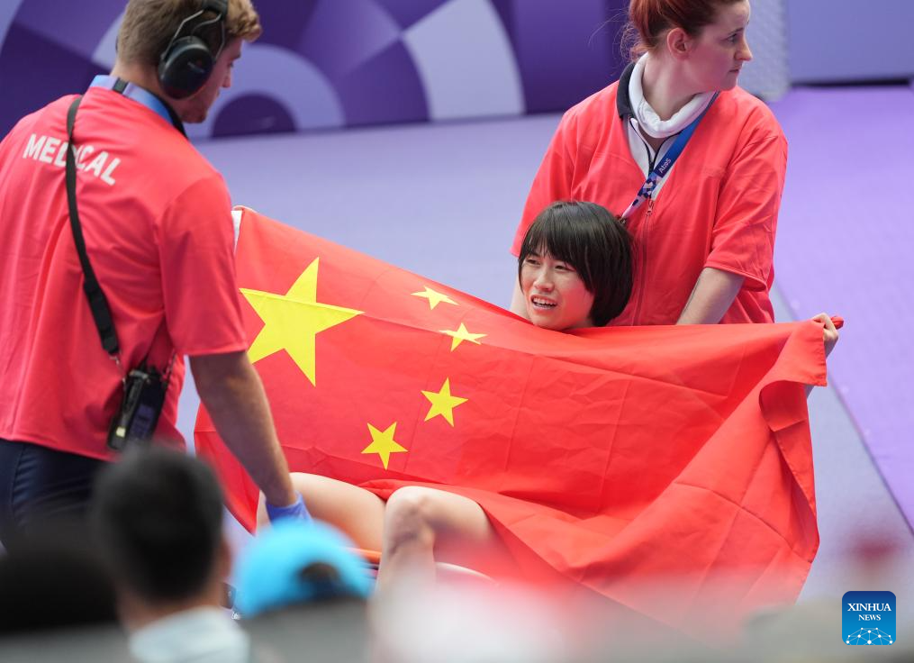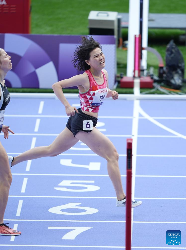 Shi Yiting (C) of China reacts after the women's 200m T36 final of para athletics at the Paris 2024 Paralympic Games in Paris, France, Sept. 1, 2024. (Xinhua/Cai Yang)