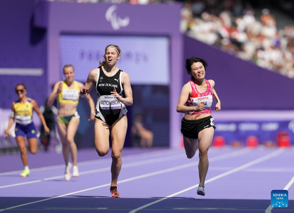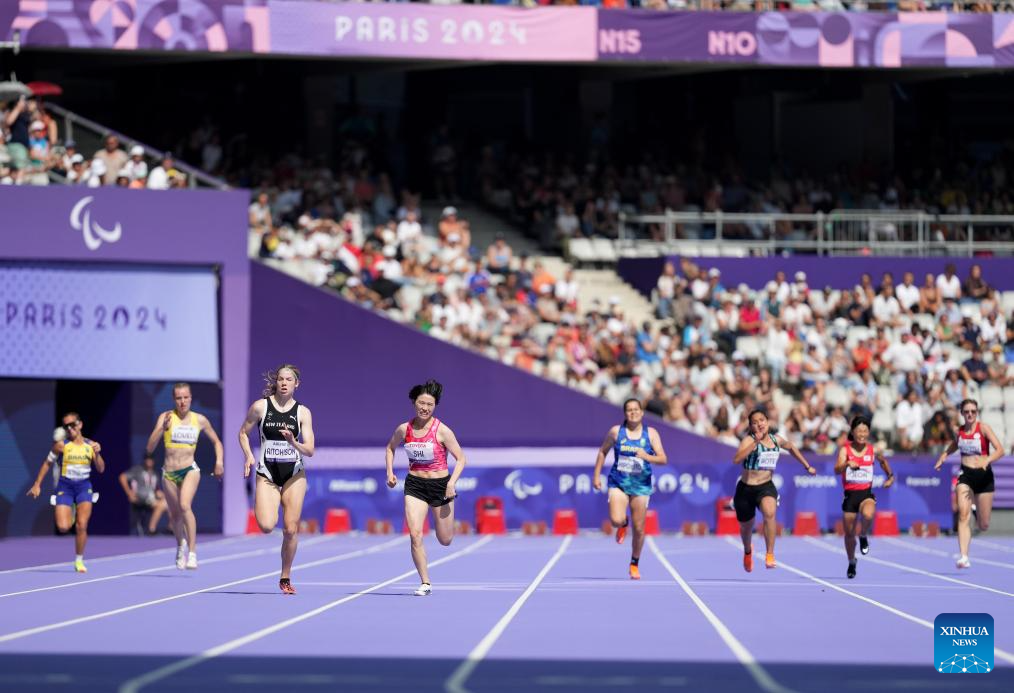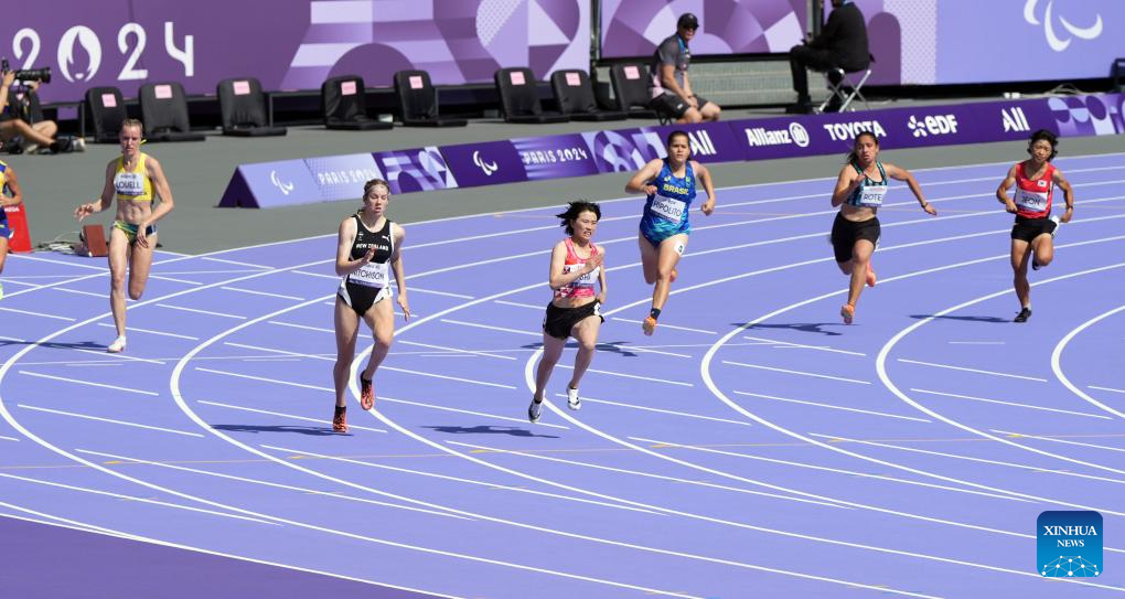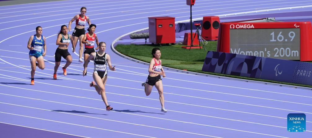 Athletes compete during the women's 200m T36 final of para athletics at the Paris 2024 Paralympic Games in Paris, France, Sept. 1, 2024. (Xinhua/Cai Yang)