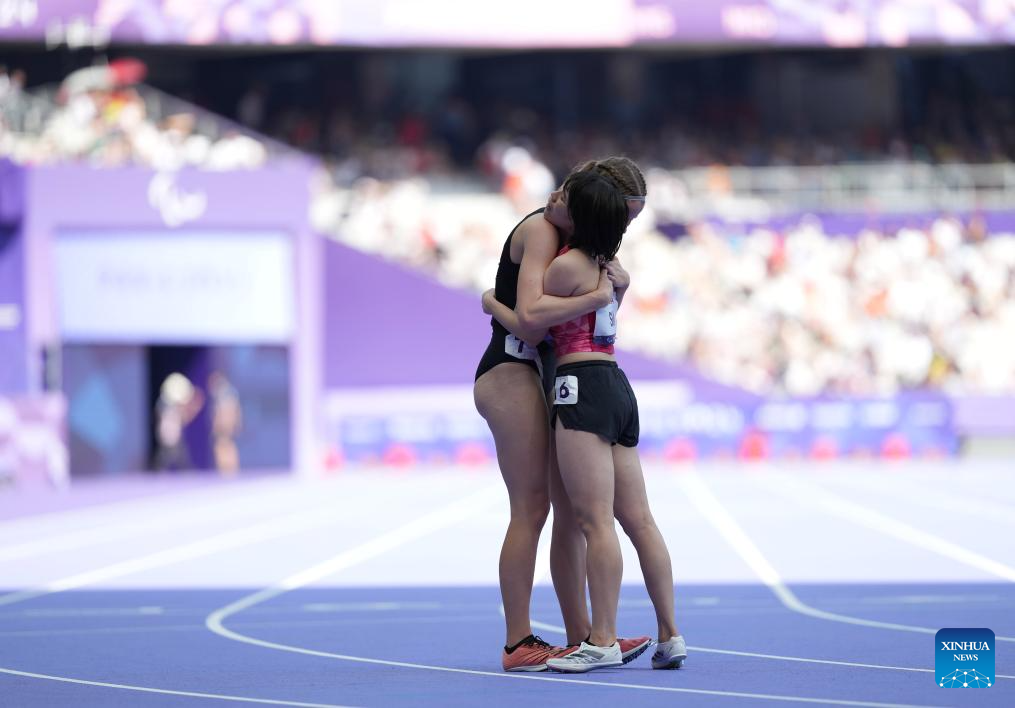 Shi Yiting (R) of China hugs Danielle Aitchison of New Zealand after the women's 200m T36 final of para athletics at the Paris 2024 Paralympic Games in Paris, France, Sept. 1, 2024. (Xinhua/He Canling)