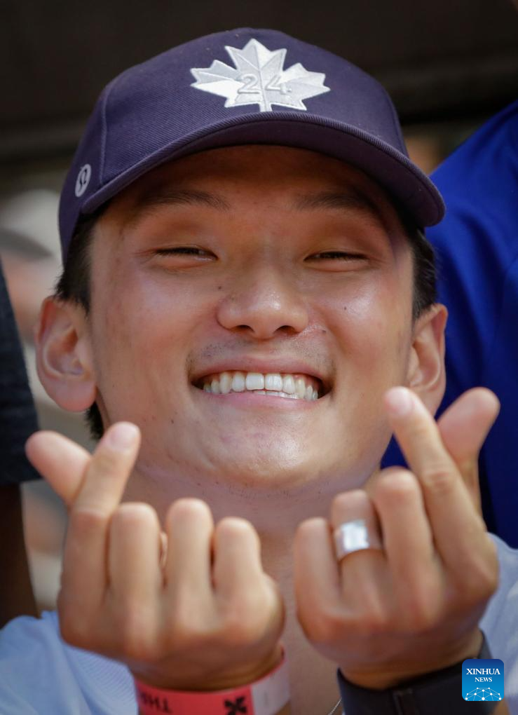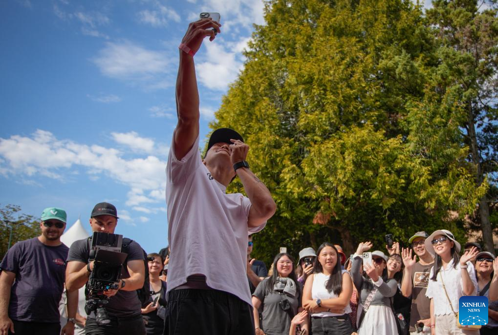 Kim Philip takes selfies with fans at the Pacific National Exhibition in Vancouver, British Columbia, Canada, Sept. 1, 2024. Paris Olympic breaking B-boys gold medallist Kim Philip of Canada, known as B-Boy Phil Wizard, made his first public appearance in Vancouver on Sunday. (Photo by Liang Sen/Xinhua)