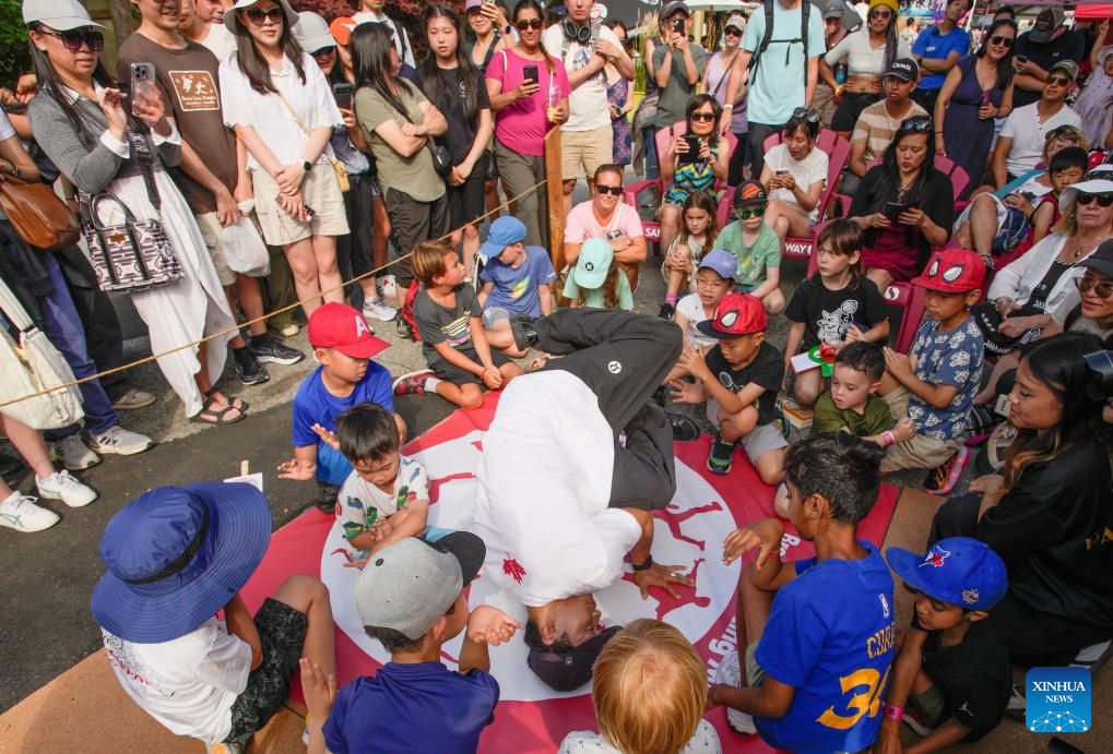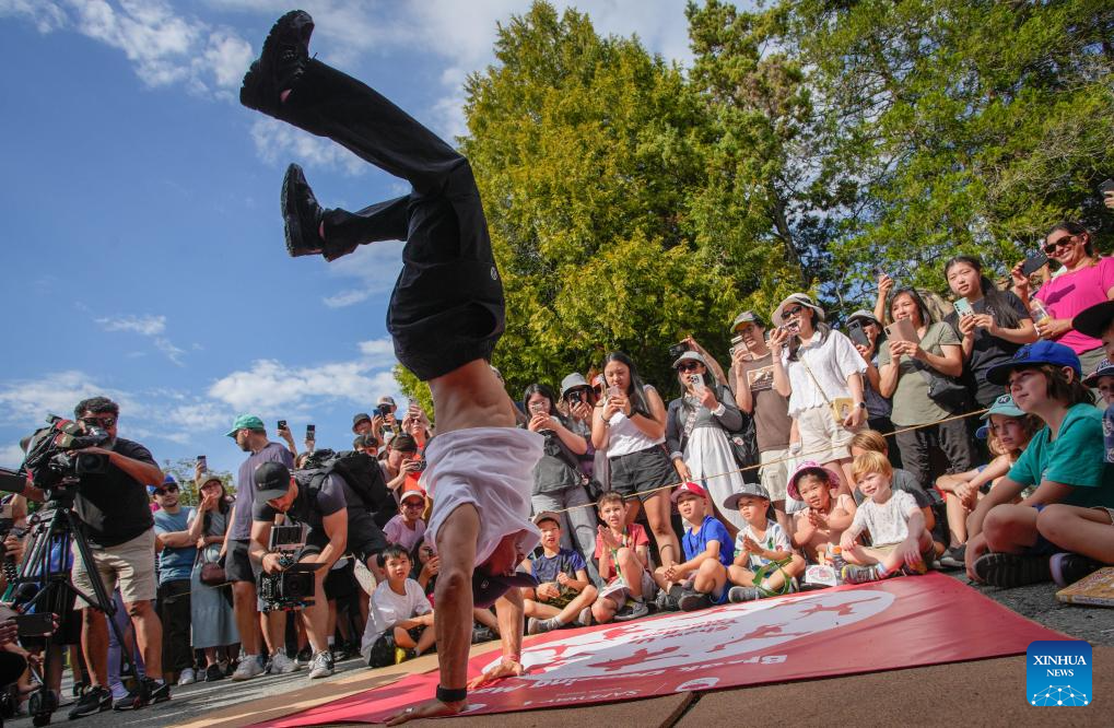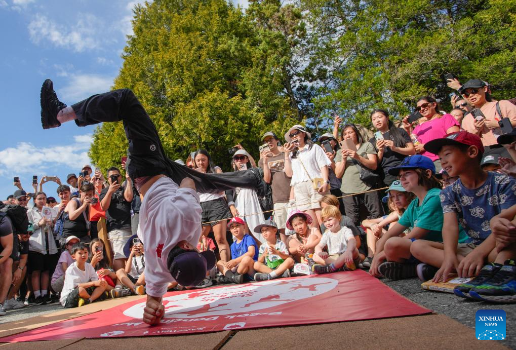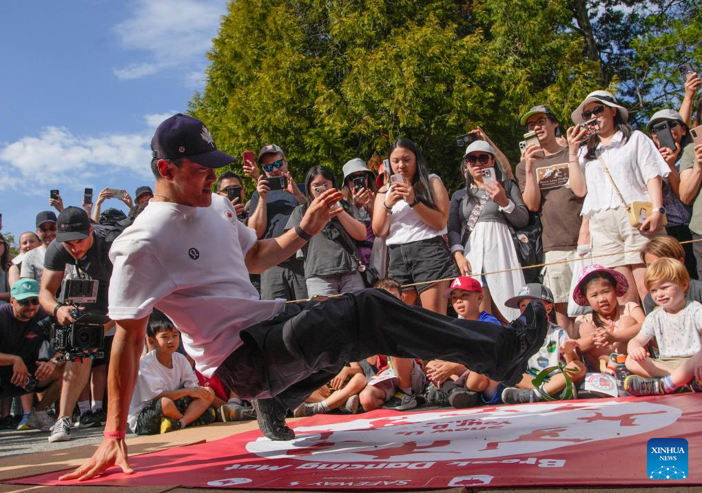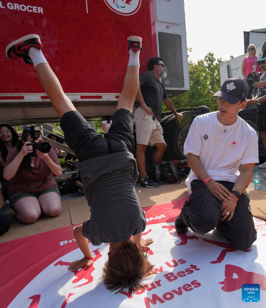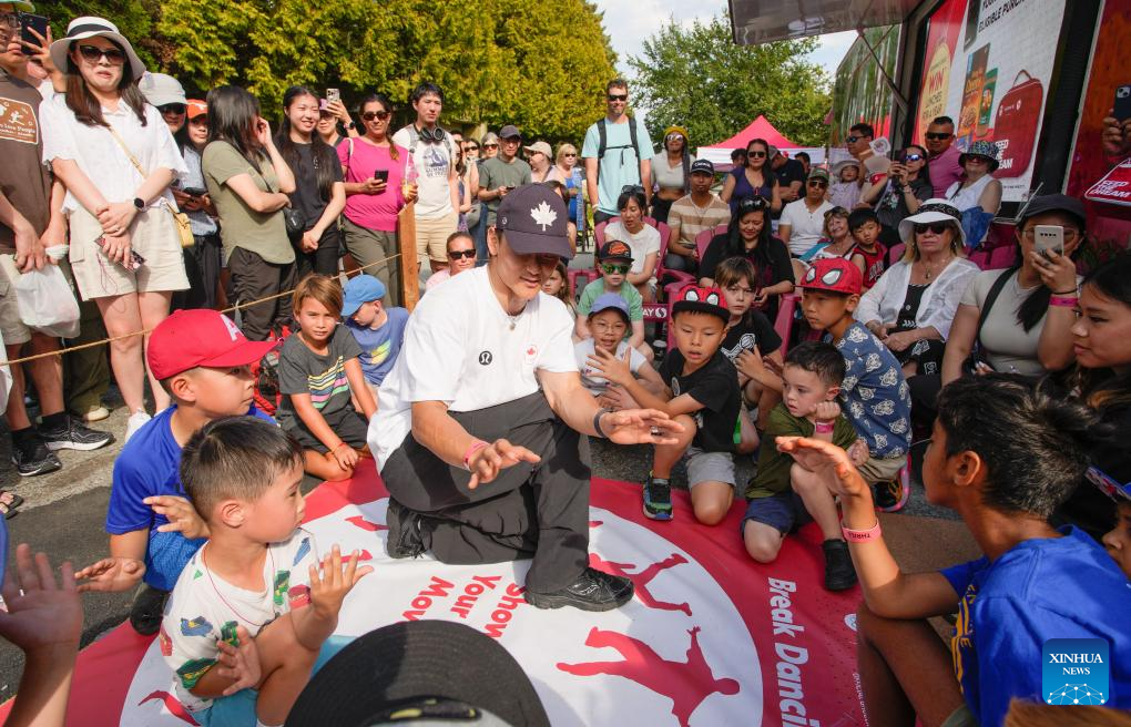 Kim Philip performs at the Pacific National Exhibition in Vancouver, British Columbia, Canada, Sept. 1, 2024. Paris Olympic breaking B-boys gold medallist Kim Philip of Canada, known as B-Boy Phil Wizard, made his first public appearance in Vancouver on Sunday. (Photo by Liang Sen/Xinhua)
