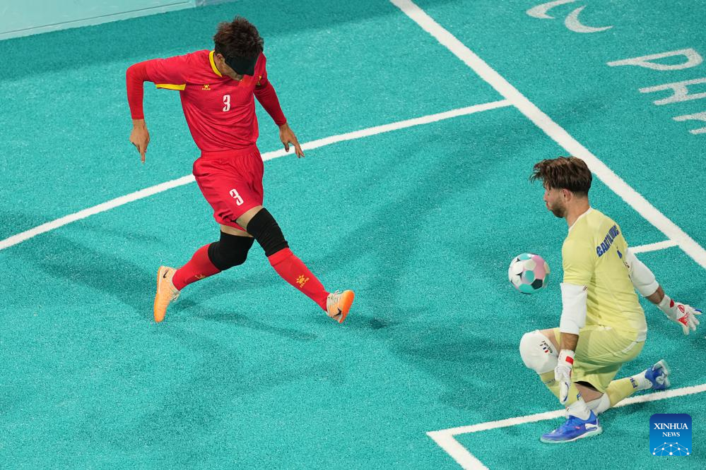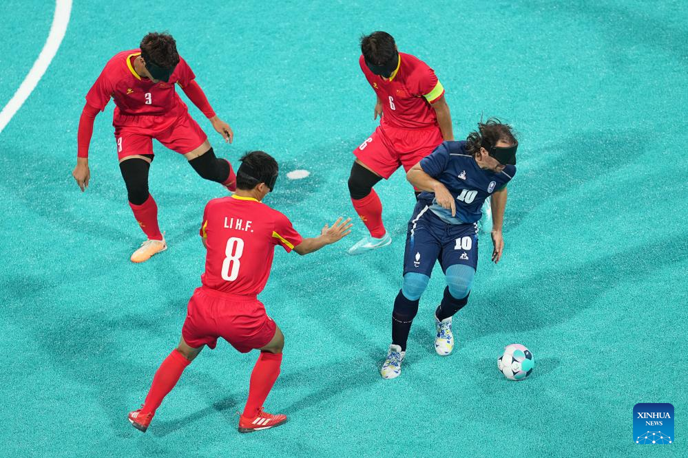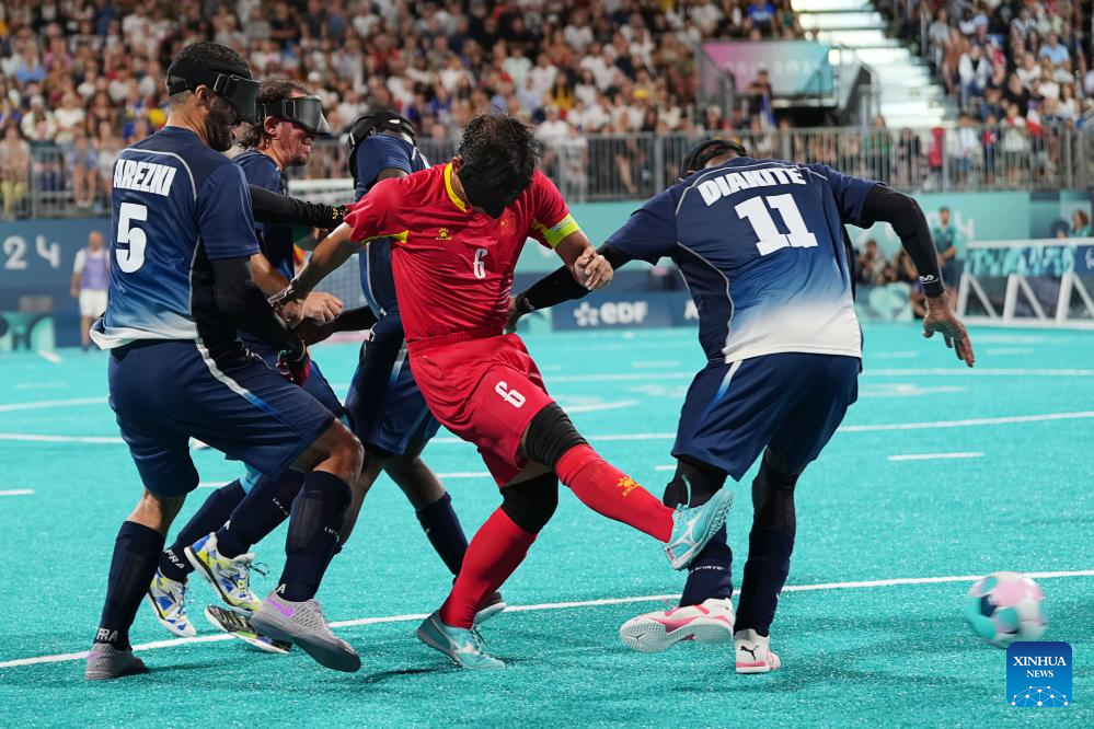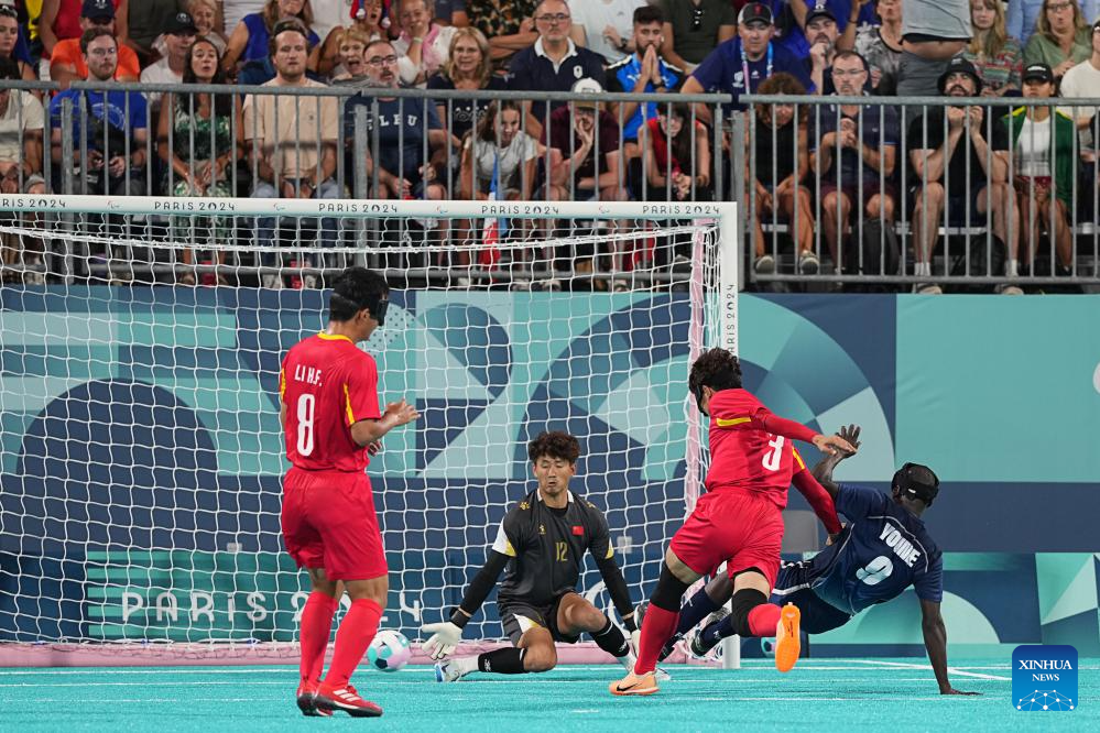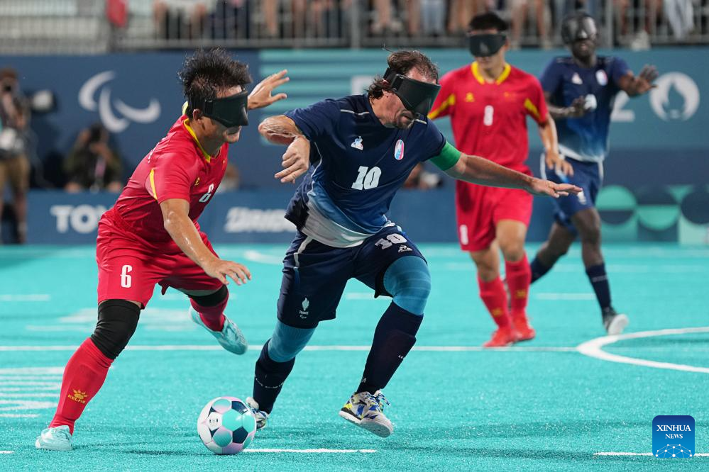 Zhang Jiabin (1sr R) of China shoots during the men's preliminary round group A match of blind football between France and China at the Paris 2024 Paralympic Games in Paris, France, Sept. 1, 2024. (Xinhua/Xiong Qi)