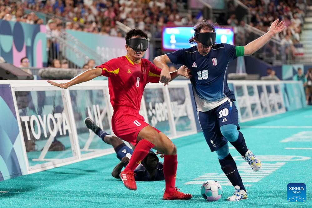 Zhu Rui (2nd R) of China vies with Freric Villeroux (1st R) of France during the men's preliminary round group A match of blind football between France and China at the Paris 2024 Paralympic Games in Paris, France, Sept. 1, 2024. (Xinhua/Xiong Qi)