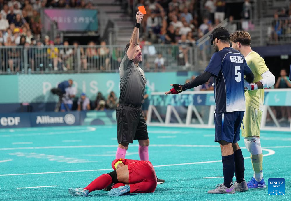 Referee shows the red card to Hakim Arezki (2nd R) of France during the men's preliminary round group A match of blind football between France and China at the Paris 2024 Paralympic Games in Paris, France, Sept. 1, 2024. (Xinhua/Xiong Qi)
