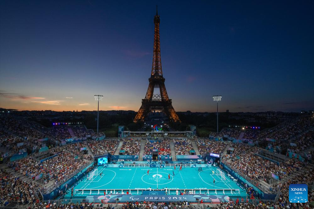 Photo taken on Sept. 1, 2024 shows the general view of the men's preliminary round group A match of blind football between France and China at the Paris 2024 Paralympic Games in Paris, France. (Xinhua/Xiong Qi)
