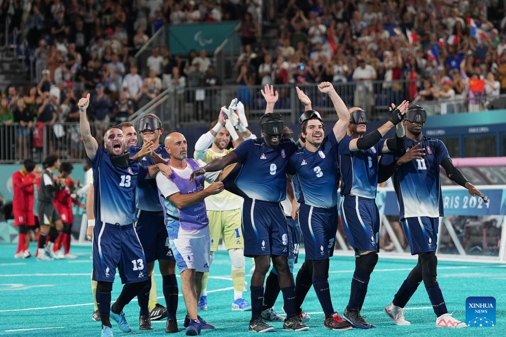 Members of team France celebrate after the men's preliminary round group A match of blind football between France and China at the Paris 2024 Paralympic Games in Paris, France, Sept. 1, 2024. (Xinhua/Xiong Qi)