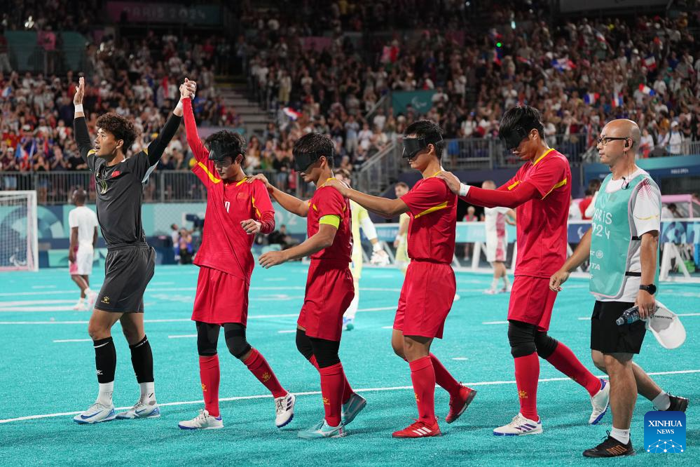 Members of team China acknowledge the spectators after the men's preliminary round group A match of blind football between France and China at the Paris 2024 Paralympic Games in Paris, France, Sept. 1, 2024. (Xinhua/Xiong Qi)