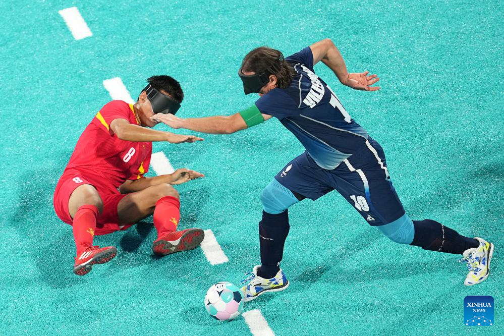 Freric Villeroux (R) of France vies with Li Haifu of China during the men's preliminary round group A match of blind football between France and China at the Paris 2024 Paralympic Games in Paris, France, Sept. 1, 2024. (Xinhua/Xiong Qi)