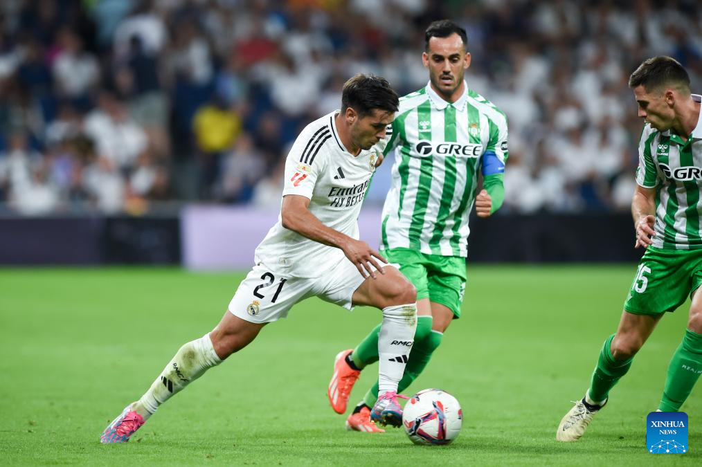 Real Madrid player Brahim Diaz (L) competes during La Liga football match between Real Madrid and Real Betis, in Santiago Bernabeu stadium, Madrid, Spain, Sept. 1, 2024. (Photo by Gustavo Valiente/Xinhua)