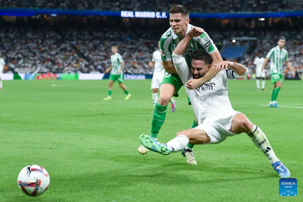 Real Madrid player Dani Carvajal (R) vies with Real Betis player Romain Perraud during La Liga football match between Real Madrid and Real Betis, in Santiago Bernabeu stadium, Madrid, Spain, Sept. 1, 2024. (Photo by Gustavo Valiente/Xinhua)