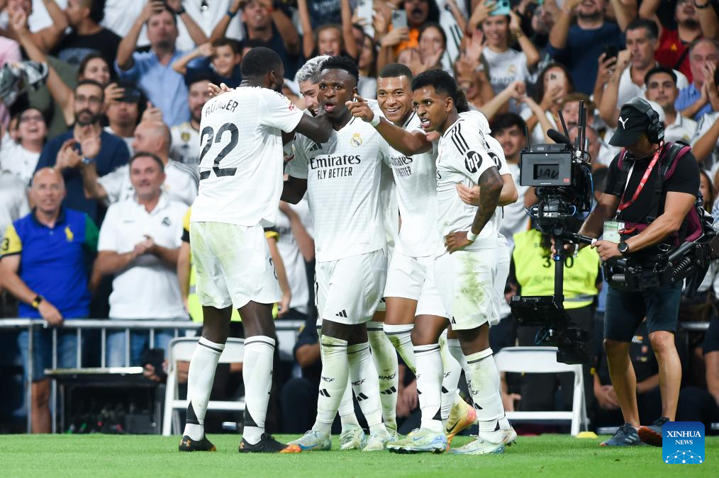 Real Madrid players celebrate a goal during La Liga football match between Real Madrid and Real Betis, in Santiago Bernabeu stadium, Madrid, Spain, Sept. 1, 2024. (Photo by Gustavo Valiente/Xinhua)