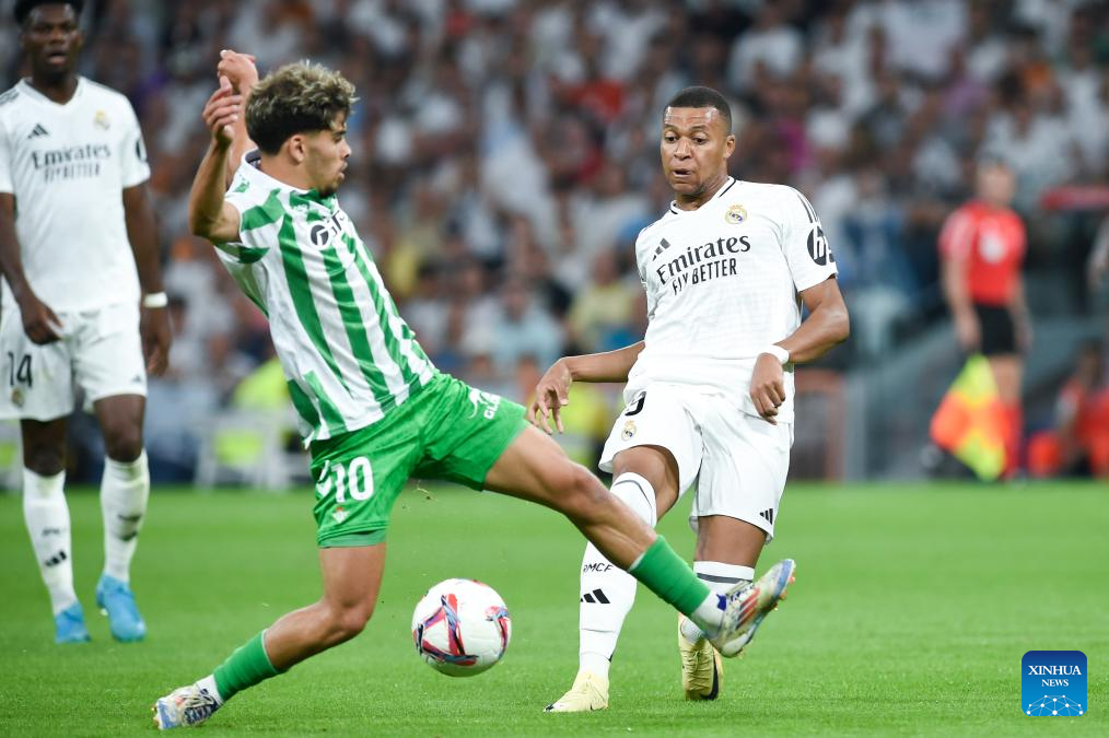 Real Madrid player Kylian Mbappe (R) vies with Real Betis player Abde Ezzalzouli during La Liga football match between Real Madrid and Real Betis, in Santiago Bernabeu stadium, Madrid, Spain, Sept. 1, 2024. (Photo by Gustavo Valiente/Xinhua)
