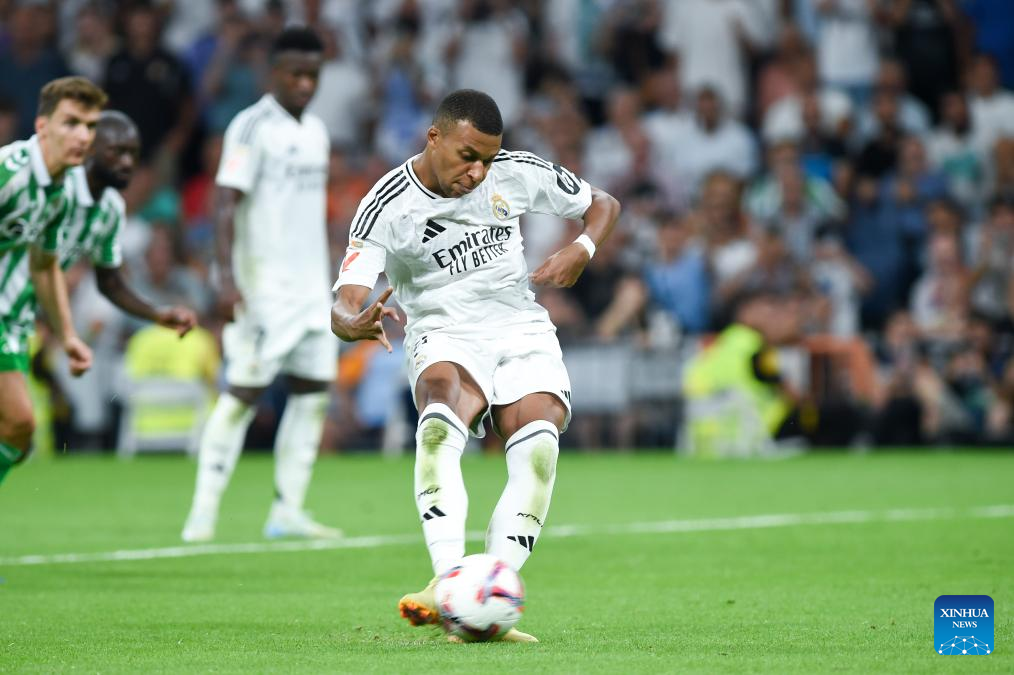 Real Madrid player Kylian Mbappe takes the penalty kick during La Liga football match between Real Madrid and Real Betis, in Santiago Bernabeu stadium, Madrid, Spain, Sept. 1, 2024. (Photo by Gustavo Valiente/Xinhua)