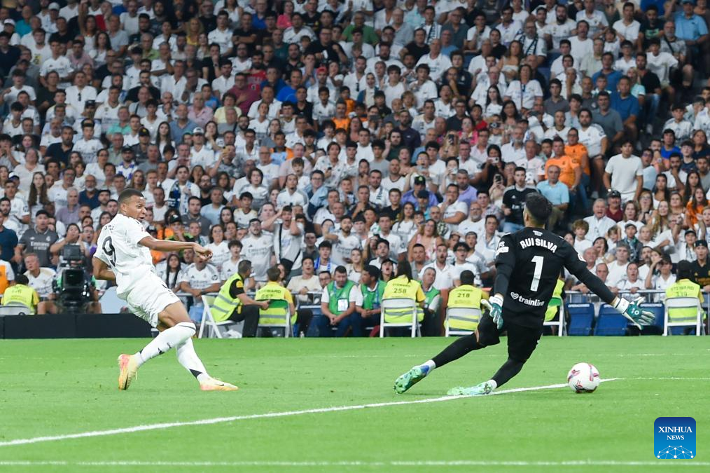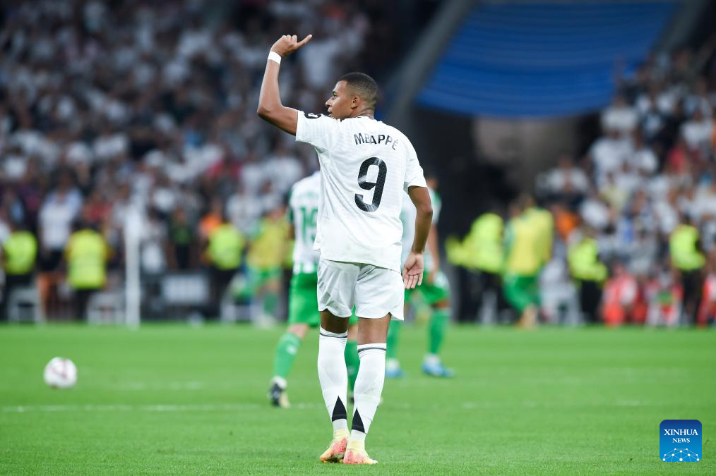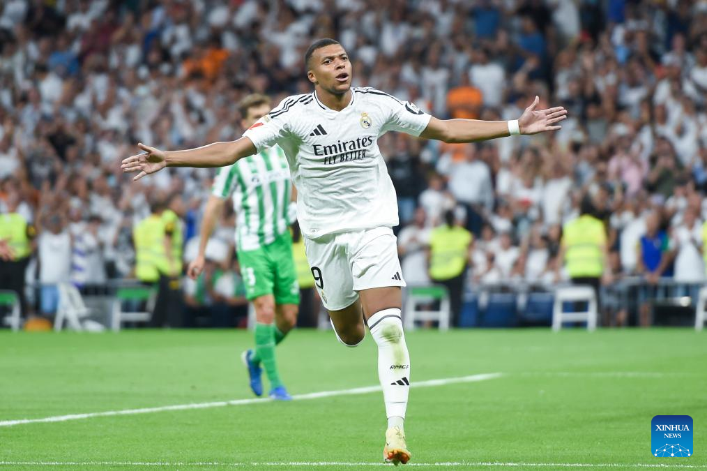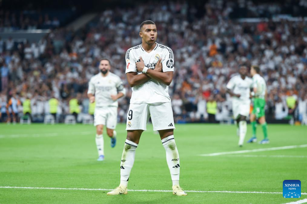 Real Madrid player Kylian Mbappe scores his first goal during La Liga football match between Real Madrid and Real Betis, in Santiago Bernabeu stadium, Madrid, Spain, Sept. 1, 2024. (Photo by Gustavo Valiente/Xinhua)