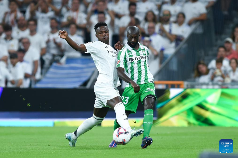 Real Madrid player Vinicius Jr. (L) vies with Real Betis player Youssouf Sabaly during La Liga football match between Real Madrid and Real Betis, in Santiago Bernabeu stadium, Madrid, Spain, Sept. 1, 2024. (Photo by Gustavo Valiente/Xinhua)