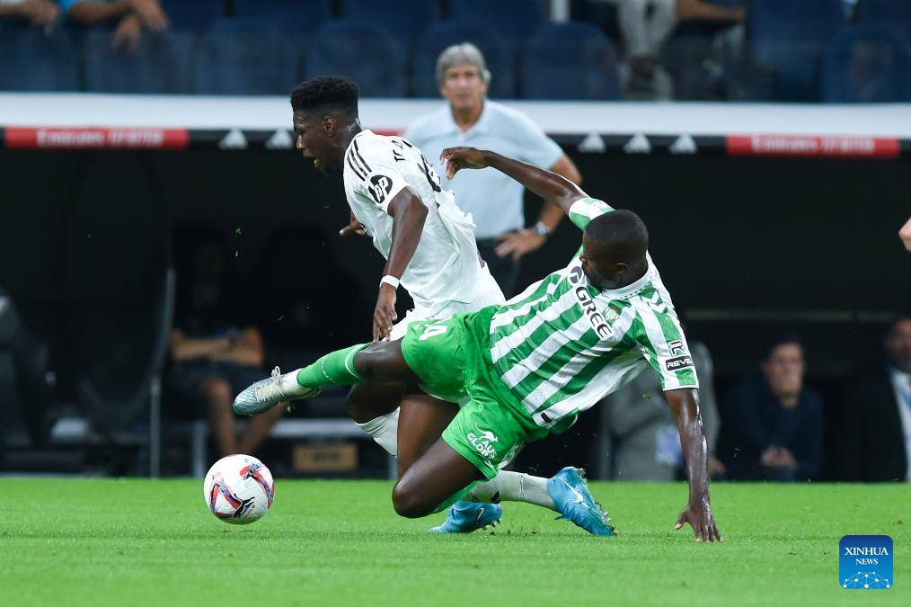 Real Madrid player Aurelien Tchouameni (L) vies with Real Betis player William Calvalho during La Liga football match between Real Madrid and Real Betis, in Santiago Bernabeu stadium, Madrid, Spain, Sept. 1, 2024. (Photo by Gustavo Valiente/Xinhua)