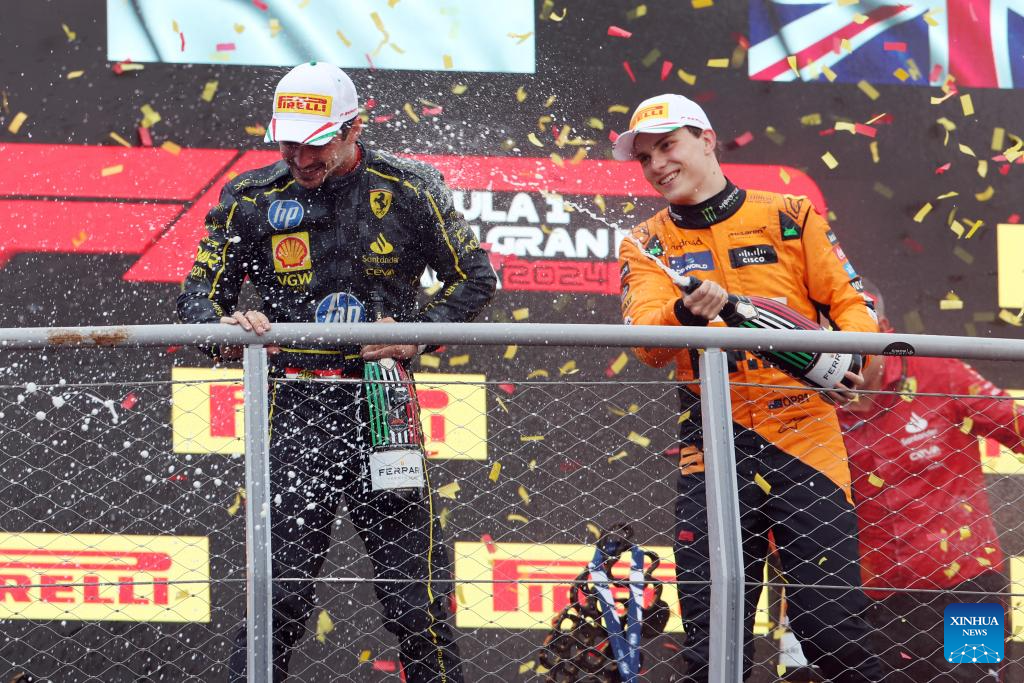 Ferrari's Monegasque driver Charles Leclerc (L) celebrates with McLaren's Australian driver Oscar Piastri during victory ceremony of the Formula 1 Italian Grand Prix at Monza Circuit, Italy, Sept. 1, 2024. (Xinhua/Zhao Dingzhe)