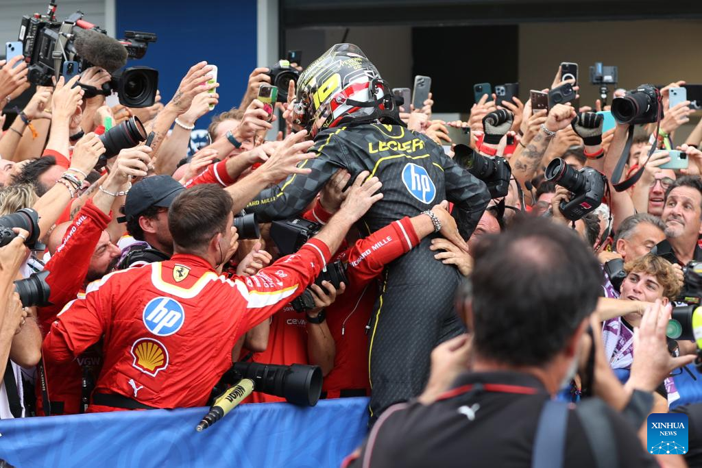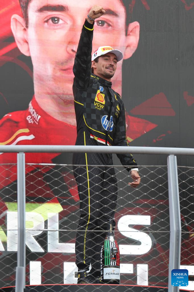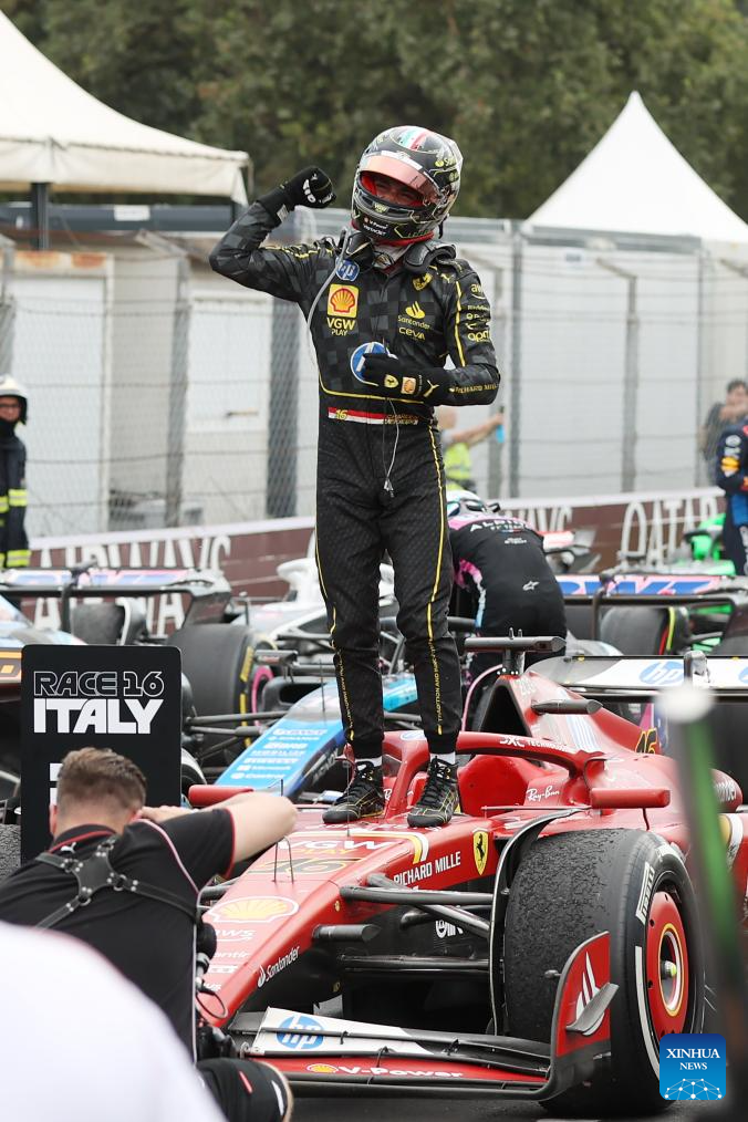 Ferrari's Monegasque driver Charles Leclerc celebrates after the Formula 1 Italian Grand Prix at Monza Circuit, Italy, Sept. 1, 2024. (Xinhua/Zhao Dingzhe)