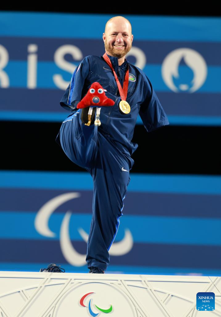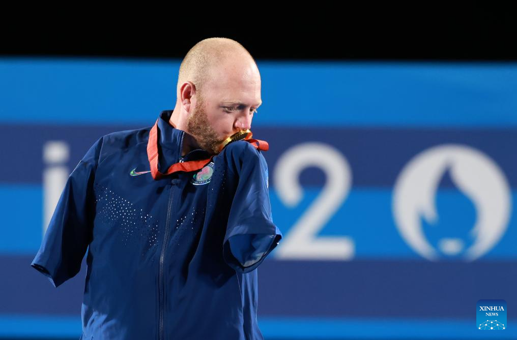 Gold medalist Matt Stutzman of the United States poses during the awarding ceremony of the para archery men's individual compound open event at the Paris 2024 Paralympic Games in Paris, France, Sept. 1, 2024. (Xinhua/Hou Jun)