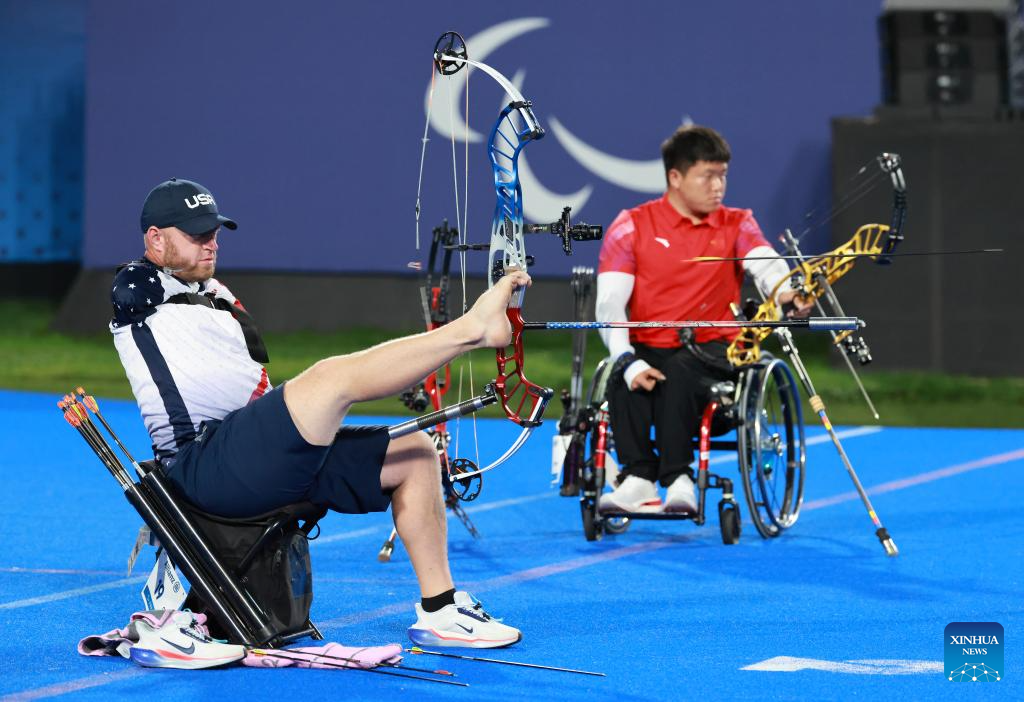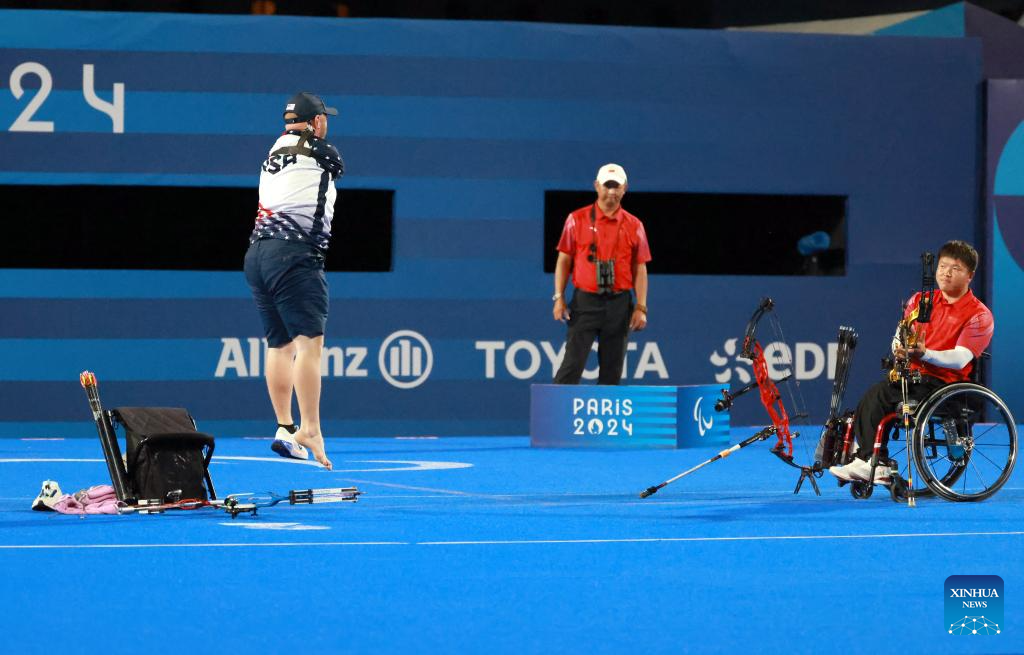 Matt Stutzman (R) of the United States competes during the para archery men's individual compound open event at the Paris 2024 Paralympic Games in Paris, France, Sept. 1, 2024. (Xinhua/Hou Jun)