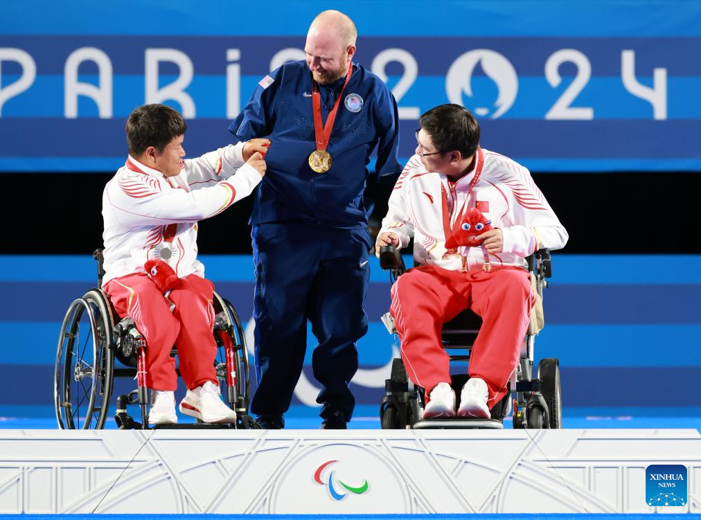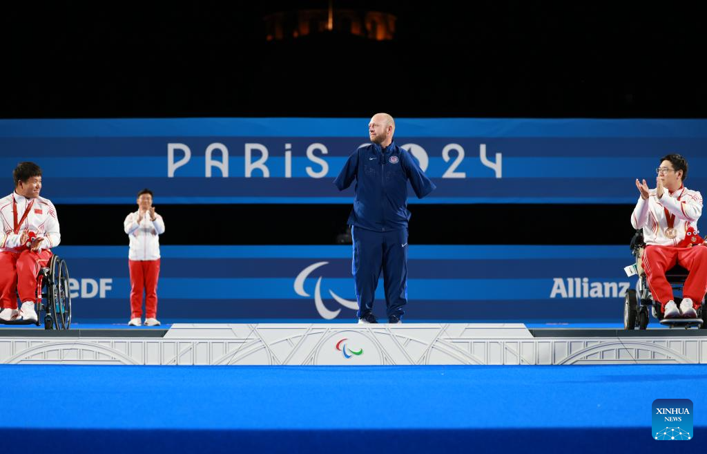 Gold medalist Matt Stutzman (C) of the United States, silver medalist Ai Xinliang (L) and bronze medalist He Zhihao of China react during the awarding ceremony of the para archery men's individual compound open event at the Paris 2024 Paralympic Games in Paris, France, Sept. 1, 2024. (Xinhua/Hou Jun)