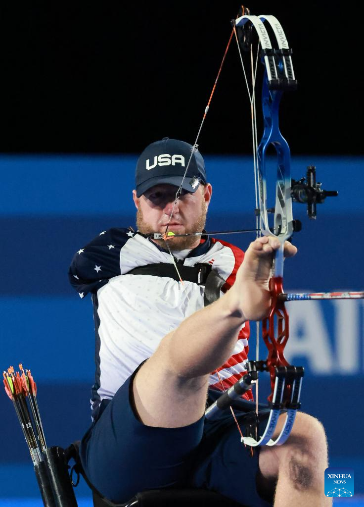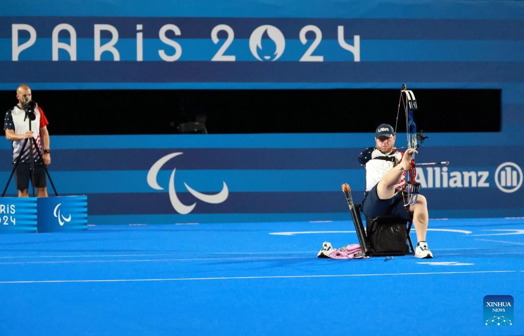 Matt Stutzman of the United States competes during the para archery men's individual compound open event at the Paris 2024 Paralympic Games in Paris, France, Sept. 1, 2024. (Xinhua/Hou Jun)