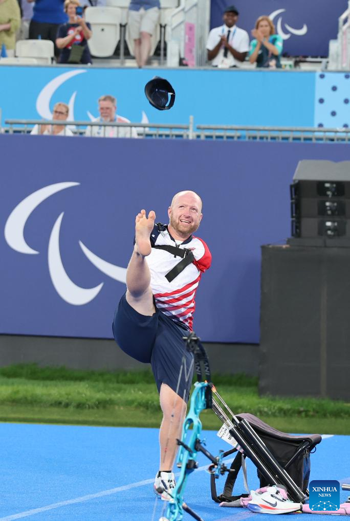 Matt Stutzman of the United States celebrates after winning the para archery men's individual compound open event at the Paris 2024 Paralympic Games in Paris, France, Sept. 1, 2024. (Xinhua/Hou Jun)