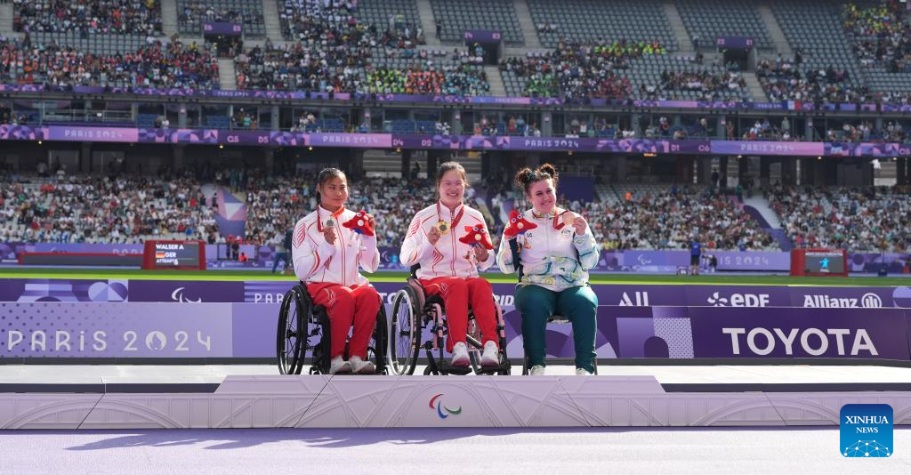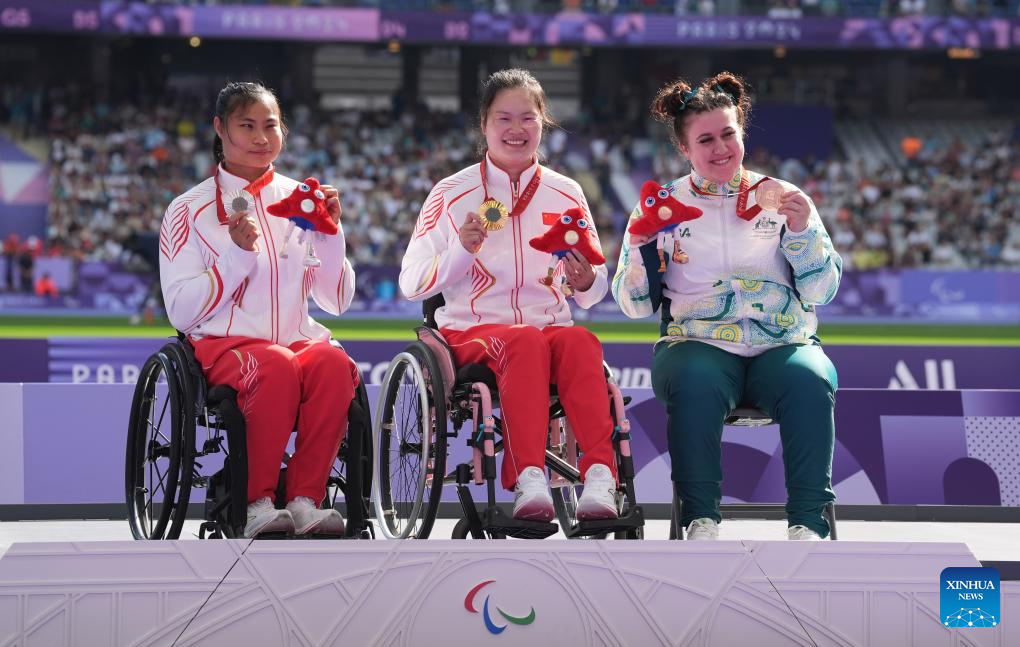 Gold medalist Zou Lijuan of China poses for photos during awarding ceremony of the women's javelin throw F34 of Para Athletics at the Paris 2024 Paralympic Games in Paris, France, Sept. 2, 2024. (Xinhua/Cai Yang)