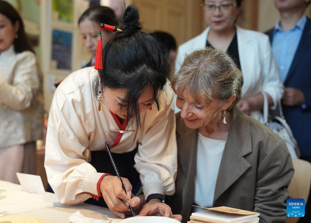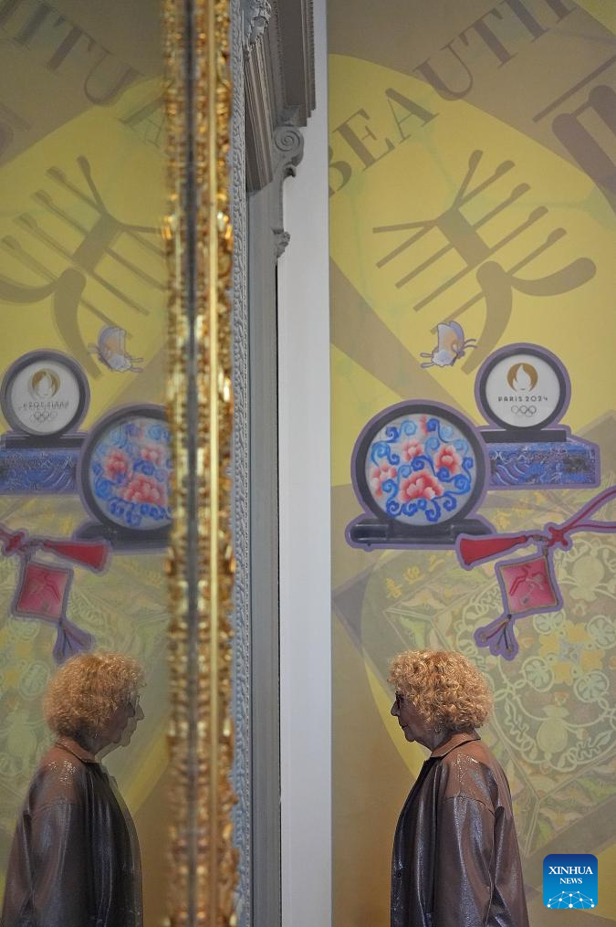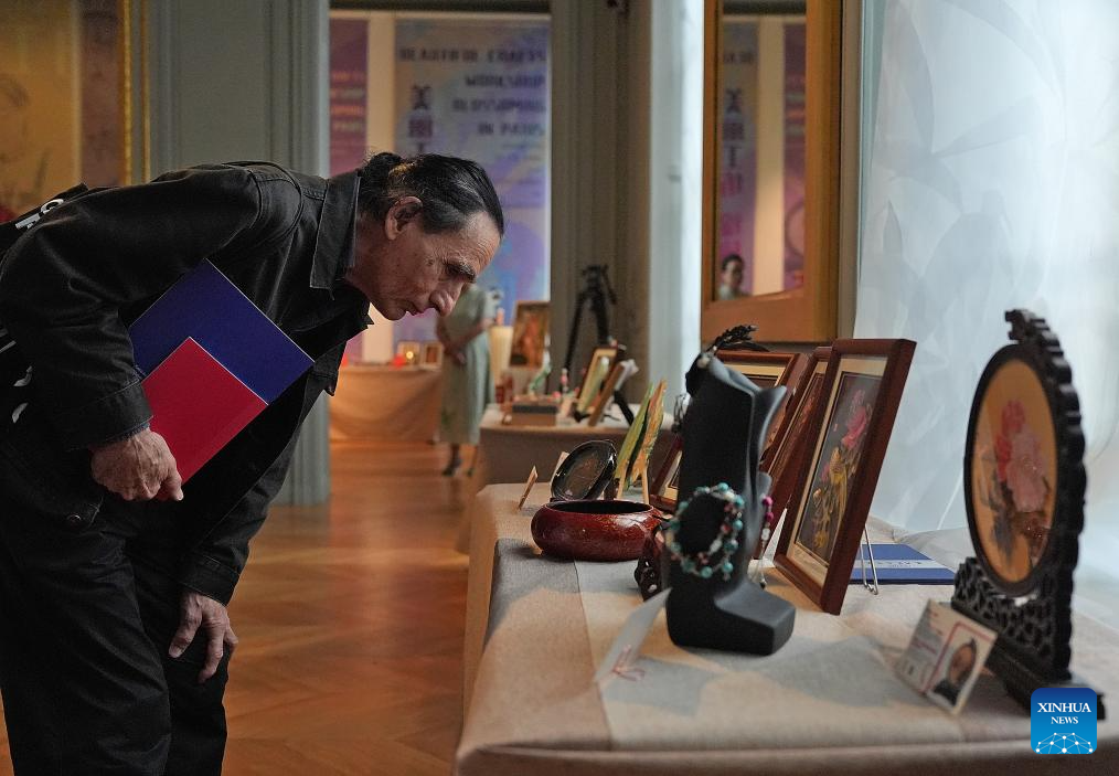 A visitor appreciates exhibits at the "Beautiful Crafts Workshop, Blossoming in Paris" exhibition of cultural and creative works by women with disabilities at Chinese Cultural Center in Paris, France, Sept. 3, 2024. (Xinhua/Hou Zhaokang)