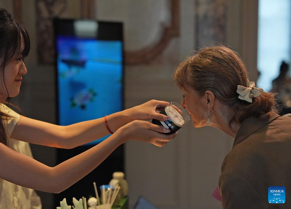 A woman tries an aromatic product during the "Beautiful Crafts Workshop, Blossoming in Paris" exhibition of cultural and creative works by women with disabilities at Chinese Cultural Center in Paris, France, Sept. 3, 2024. (Xinhua/Hou Zhaokang)