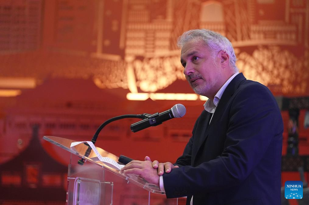 Ernesto Ottone, assistant director general for culture at UNESCO, speaks during the opening ceremony of the "Beautiful Crafts Workshop, Blossoming in Paris" exhibition of cultural and creative works by women with disabilities at Chinese Cultural Center in Paris, France, Sept. 3, 2024. (Xinhua/Hou Zhaokang)