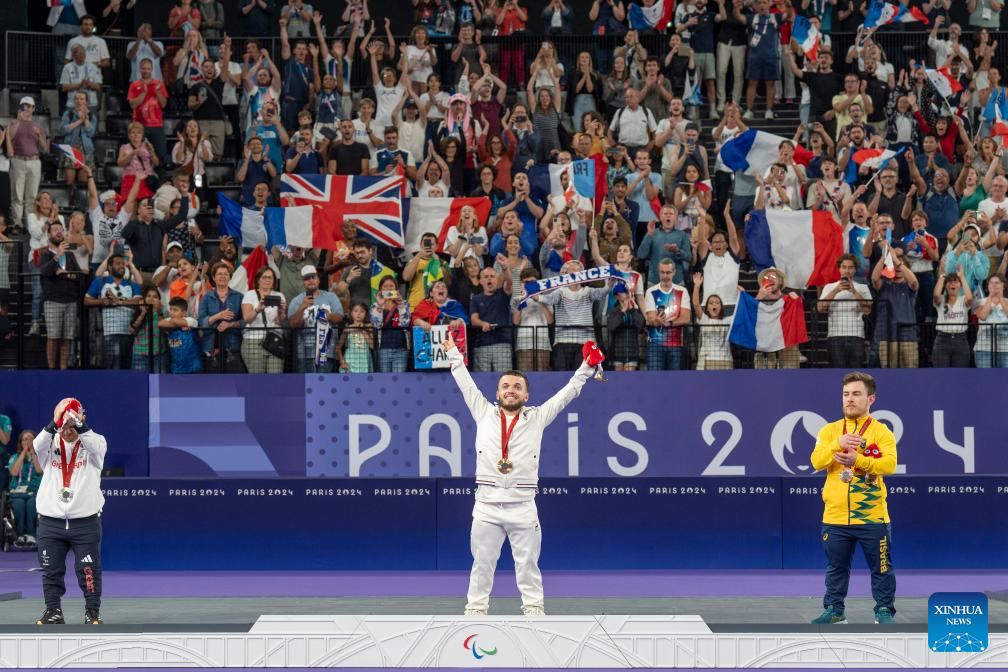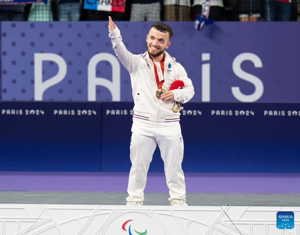 Gold medalist Charles Noakes of France reacts during the awarding ceremony after the men's singles SH6 gold medal match of para badminton at the Paris 2024 Paralympic Games in Paris, France, Sept. 2, 2024. (Xinhua/Cai Yang)