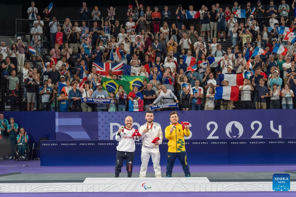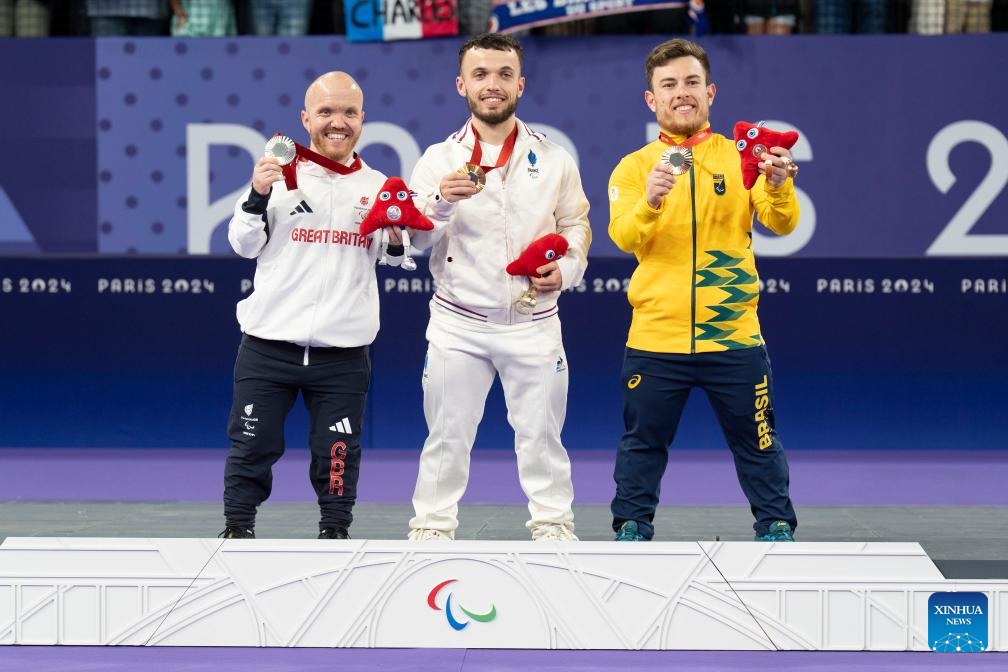 Gold medalist Charles Noakes (C) of France, silver medalist Krysten Coombs (L) of Britain and bronze medalist Vitor Tavares of Brazil react during the awarding ceremony after the men's singles SH6 gold medal match of para badminton at the Paris 2024 Paralympic Games in Paris, France, Sept. 2, 2024. (Xinhua/Cai Yang)