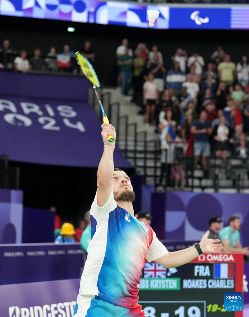 Charles Noakes of France hits a return during the men's singles SH6 gold medal match of para badminton against Krysten Coombs of Britain at the Paris 2024 Paralympic Games in Paris, France, Sept. 2, 2024. (Xinhua/He Canling)