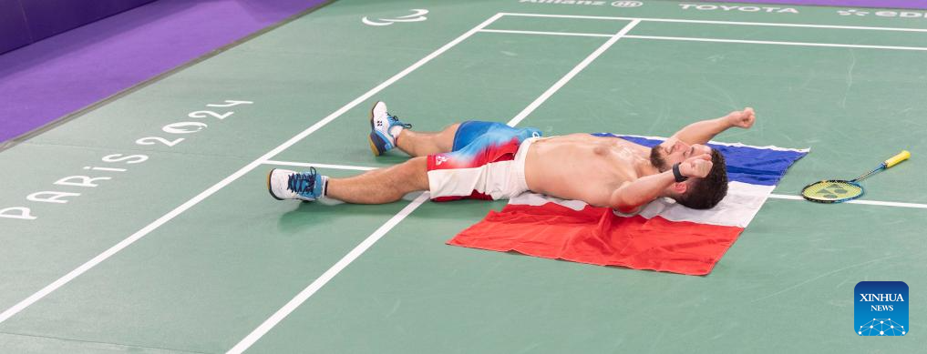 Charles Noakes of France celebrates victory after winning the men's singles SH6 gold medal match of para badminton against Krysten Coombs of Britain at the Paris 2024 Paralympic Games in Paris, France, Sept. 2, 2024. (Xinhua/Cai Yang)