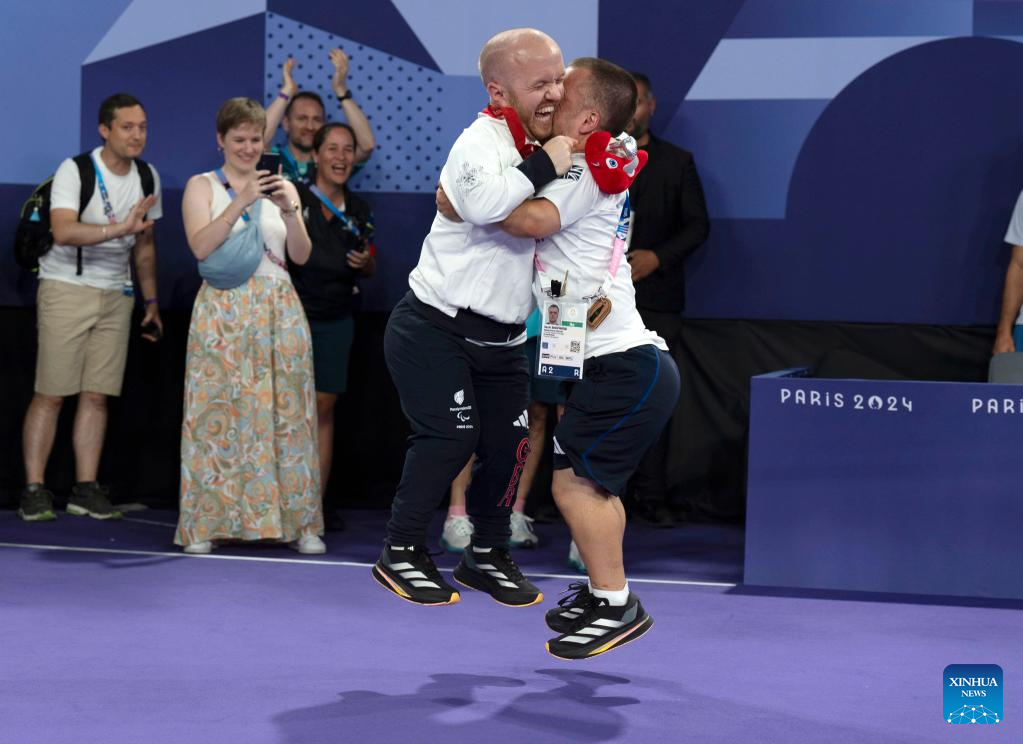 Krysten Coombs (L) of Britain celebrates with teammate Jack Shephard after the men's singles SH6 gold medal match of para badminton against Charles Noakes of France at the Paris 2024 Paralympic Games in Paris, France, Sept. 2, 2024. (Xinhua/Cai Yang)