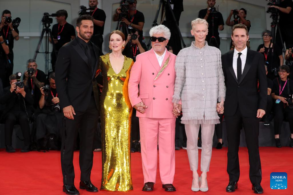 Alvise Rigo, Julianne Moore, Pedro Almodovar, Tilda Swinton, and Alessandro Nivola (from L to R) pose for a photo at the red carpet before the premiere of the film "The Room Next Door" during the 81st Venice Film Festival in Venice, Italy, on Sept. 2, 2024. (Xinhua/Li Jing)
