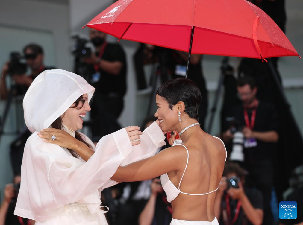 Canadian actress Taylor Russell (R) and Brazilian actress Barbara Paz are seen at the red carpet before the premiere of the film "The Room Next Door" during the 81st Venice Film Festival in Venice, Italy, on Sept. 2, 2024. (Xinhua/Li Jing)