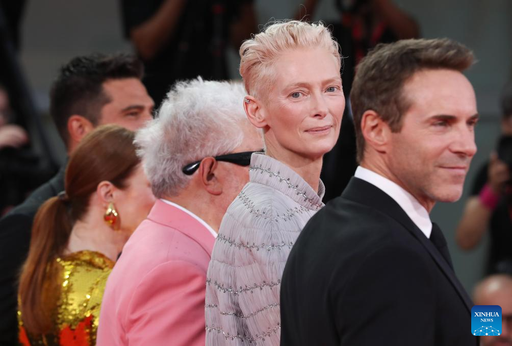 Actress Tilda Swinton (2nd R) is seen at the red carpet before the premiere of the film "The Room Next Door" during the 81st Venice Film Festival in Venice, Italy, on Sept. 2, 2024. (Xinhua/Li Jing)