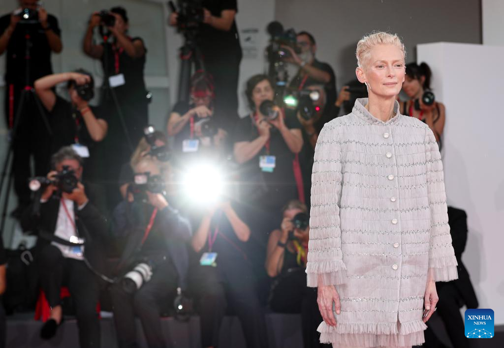 Actress Tilda Swinton poses for a photo at the red carpet before the premiere of the film "The Room Next Door" during the 81st Venice Film Festival in Venice, Italy, on Sept. 2, 2024. (Xinhua/Li Jing)