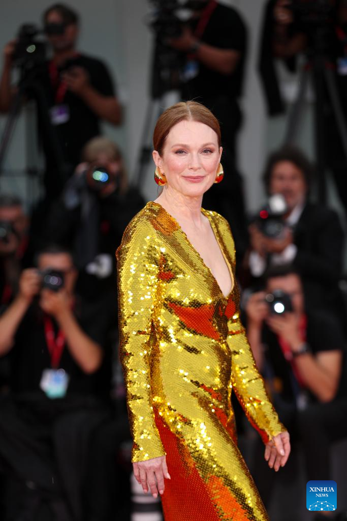 Actress Julianne Moore poses for a photo at the red carpet before the premiere of the film "The Room Next Door" during the 81st Venice Film Festival in Venice, Italy, on Sept. 2, 2024. (Xinhua/Li Jing)