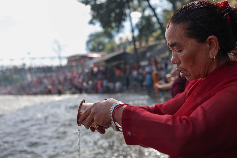 A woman performs a ritual during Kuse Aunsi, or Father's Day, at Gokarna Temple on the bank of Bagmati River in Kathmandu, Nepal, Sept. 2, 2024. (Photo by Sulav Shrestha/Xinhua)