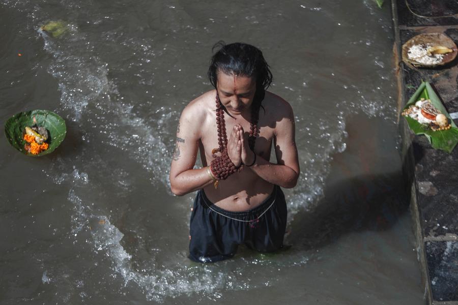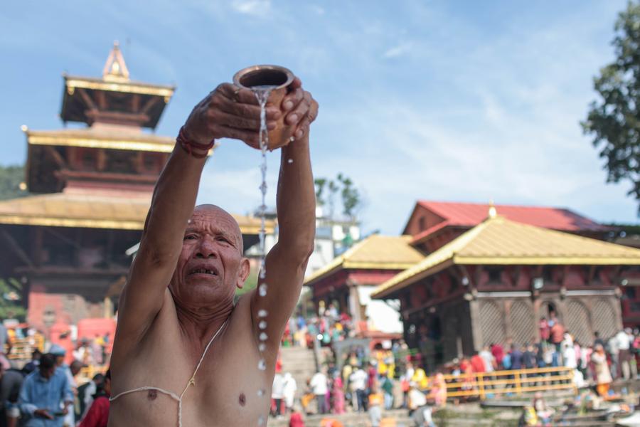 KATHMANDU, Sept. 3 (Xinhua) -- Nothing stops sons and daughters from celebrating Kuse Aunsi, or Father's Day, in Kathmandu, Nepal, during which many of them offer prayers to the Shiva shrine at Gokarna Temple.