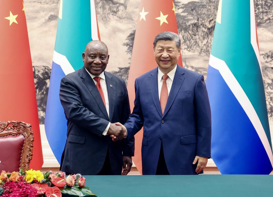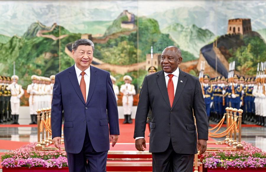 Chinese President Xi Jinping holds a welcoming ceremony for South African President Cyril Ramaphosa, who is in Beijing for the 2024 Summit of the Forum on China-Africa Cooperation (FOCAC) and a state visit, in the Northern Hall of the Great Hall of the People prior to their meeting in Beijing, capital of China, Sept. 2, 2024. Xi held talks with Ramaphosa at the Great Hall of the People in Beijing on Monday. (Xinhua/Yao Dawei)Chinese President Xi Jinping holds talks with South African President Cyril Ramaphosa, who is in Beijing for the 2024 Summit of the Forum on China-Africa Cooperation (FOCAC) and a state visit, at the Great Hall of the People in Beijing, capital of China, Sept. 2, 2024. (Xinhua/Li Xueren)Chinese President Xi Jinping holds a welcoming ceremony for South African President Cyril Ramaphosa, who is in Beijing for the 2024 Summit of the Forum on China-Africa Cooperation (FOCAC) and a state visit, in the Northern Hall of the Great Hall of the People prior to their meeting in Beijing, capital of China, Sept. 2, 2024. Xi held talks with Ramaphosa at the Great Hall of the People in Beijing on Monday. (Xinhua/Zhai Jianlan)Chinese President Xi Jinping holds a welcoming ceremony for South African President Cyril Ramaphosa, who is in Beijing for the 2024 Summit of the Forum on China-Africa Cooperation (FOCAC) and a state visit, in the Northern Hall of the Great Hall of the People prior to their meeting in Beijing, capital of China, Sept. 2, 2024. Xi held talks with Ramaphosa at the Great Hall of the People in Beijing on Monday. (Xinhua/Li Xueren)Chinese President Xi Jinping holds a welcoming ceremony for South African President Cyril Ramaphosa, who is in Beijing for the 2024 Summit of the Forum on China-Africa Cooperation (FOCAC) and a state visit, in the Northern Hall of the Great Hall of the People prior to their meeting in Beijing, capital of China, Sept. 2, 2024. Xi held talks with Ramaphosa at the Great Hall of the People in Beijing on Monday. (Xinhua/Li Xueren)Chinese President Xi Jinping holds talks with South African President Cyril Ramaphosa, who is in Beijing for the 2024 Summit of the Forum on China-Africa Cooperation (FOCAC) and a state visit, at the Great Hall of the People in Beijing, capital of China, Sept. 2, 2024. (Xinhua/Zhai Jianlan)Chinese President Xi Jinping and South African President Cyril Ramaphosa witness the signing of a raft of bilateral cooperation documents after their meeting at the Great Hall of the People in Beijing, capital of China, Sept. 2, 2024. Xi held talks with Ramaphosa, who is in Beijing for the 2024 Summit of the Forum on China-Africa Cooperation (FOCAC) and a state visit, at the Great Hall of the People in Beijing on Monday. (Xinhua/Yao Dawei)■