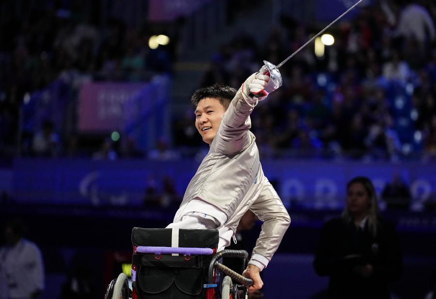 Feng Yanke of China celebrates after the Men's Sabre Category B of wheelchair fencing against Michal Dabrowski of Poland at the Paris 2024 Paralympic Games in Paris, France, Sept. 3, 2024. (Xinhua/Zhang Haofu)