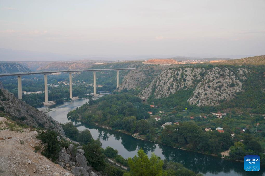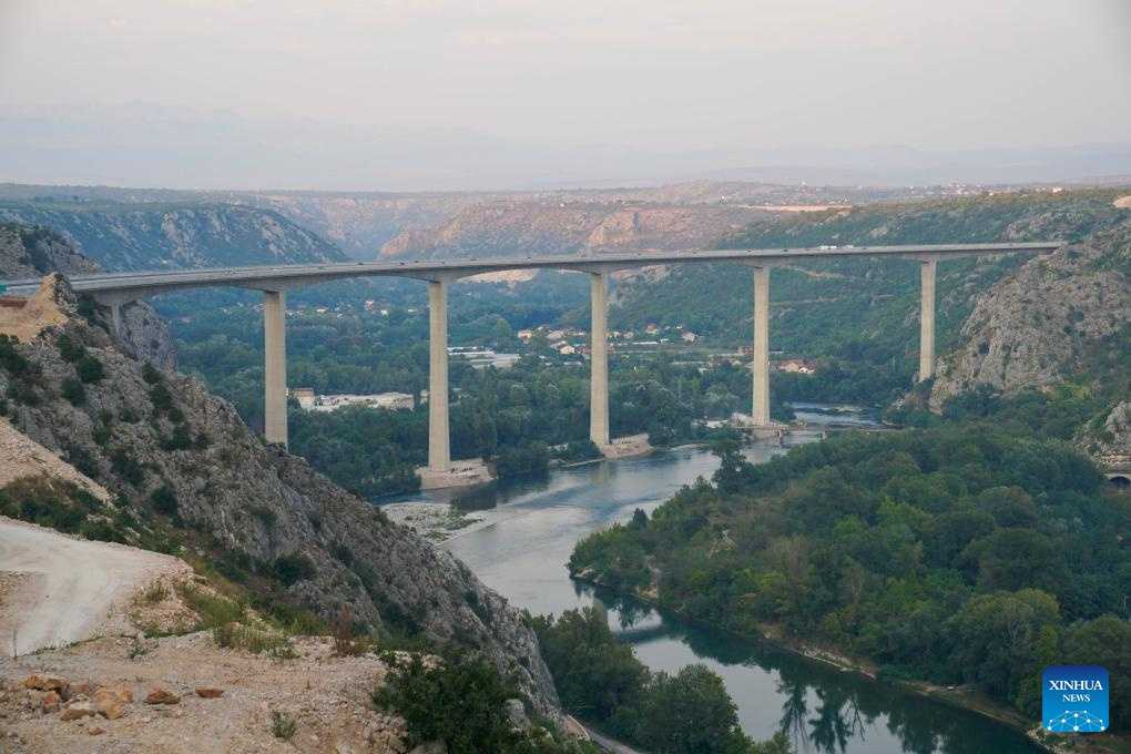This photo taken on Sept. 4, 2024 shows the Hercegovina Bridge along the Pocitelj - Zvirovici subsection project, part of the pan-European Corridor Vc highway, in Capljina, Bosnia and Herzegovina (BiH). A subsection of a new highway in Bosnia and Herzegovina (BiH), constructed by a consortium of Chinese and Azerbaijani companies, opened on Thursday.(Xinhua/Yin Xiaosheng)